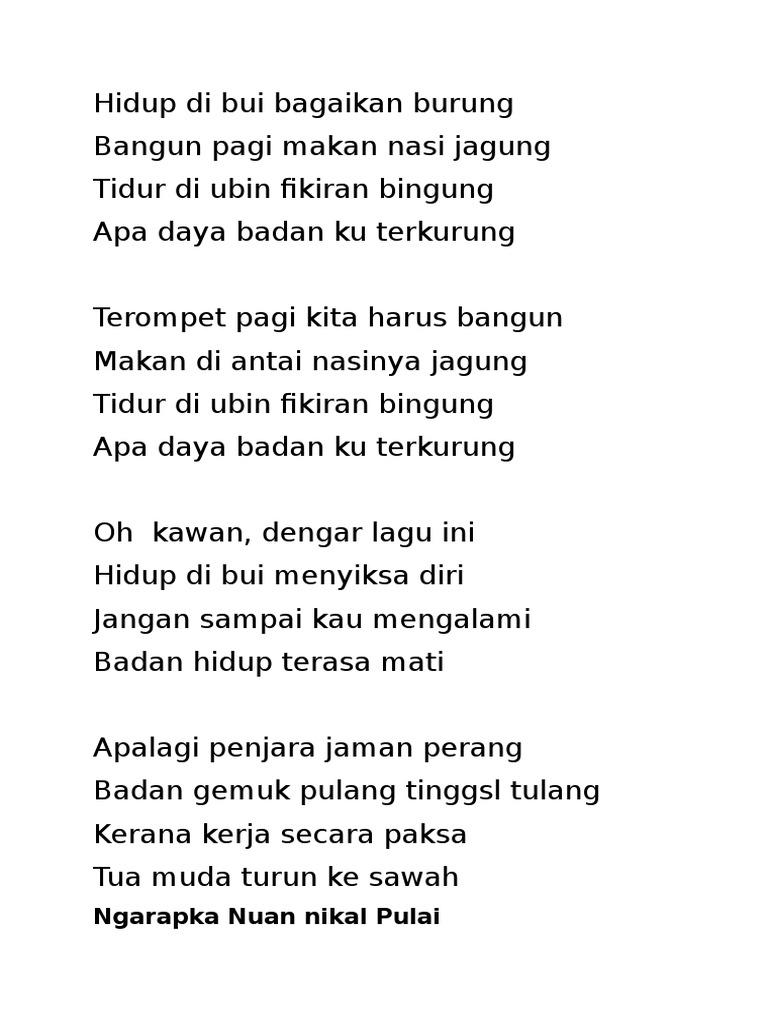 Hidup di bumi bagaikan burung bangun pagi makan nasi jagung tidur di ubin fikiran bingung apa daya badan ku terkurung terompet pagi kita harus bangun makan di antai nasinya jagung tidur di ubin fikiran bingung apa daya badan ku terkurung ( korus ) oh kawan, dengar lagu ini hidup di bumi menyiksa diri jangan sampai kau mengalami badan hidup terasa mati apalagi penjara jaman perang masuk gemuk.